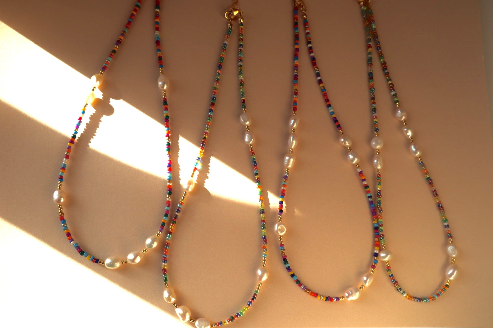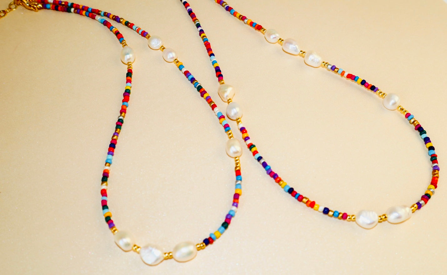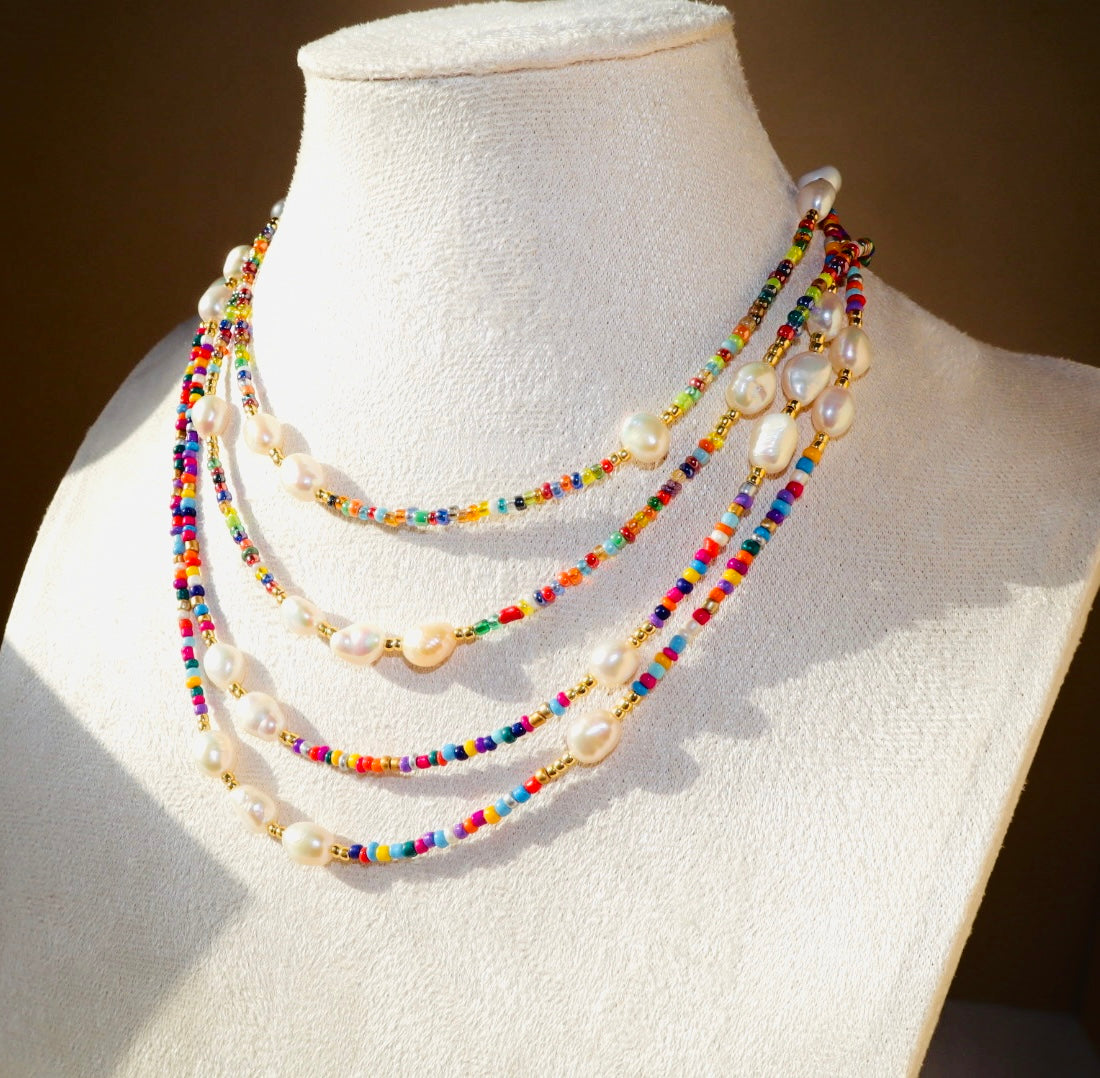 Colorful beads dance alongside freshwater pearls, a quiet reminder that softness and joy can exist in the same breath.