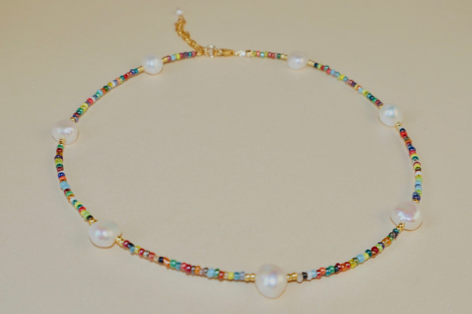 Hand-strung with colorful seed beads and accented with larger freshwater pearls, she carries a quiet presence. Still playful, but with a softness that feels more intentional… more embodied.